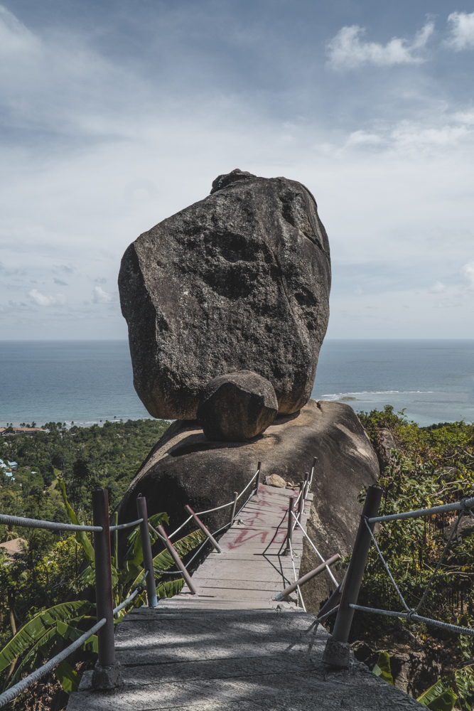 Išsistūmėme motorolerį atgal į kelią ir galiausiai užkilau (jau viena) iki vietos, kurioje galėjome pasistatyti motorolerį. Įėjimas prie šio Overlap stone žmogui kainavo 50 thb. Akmuo buvo tikrai įspūdingo dydžio, su priešais jį padarytu mediniu tilteliu, kas labai pagyvino vaizdą. Pirmas minutes buvo sunku džiaugtis, nes vis dar buvome ištikti šoko, bet emocijos pamažu atslūgo. Liko tik saugiai grįžti iki pagrindinės gatvės, iš kurios atvažiavome. Rokui perdaviau estafetę, o pati ėjau pėsčiomis. Nebenorėjau nei vairuoti, nei kažkur važiuoti. Svarstėme grąžinti motorolerį nuomotojai, bet priėjome bendrą išvadą, kad geriau apvažiuoti viską, kas liko ir po to gyventi ramiai. Taip pat planavome pamatyti Grandfather’s Grandmother’s Rocks – Hin Ta Hin Ya, taip ir padarėme. Tai vietovė, pietiniame Koh Samui gale, Lamai paplūdimyje, kuriame yra išsidėsčiusios milžiniškos ir ovalios uolienos.