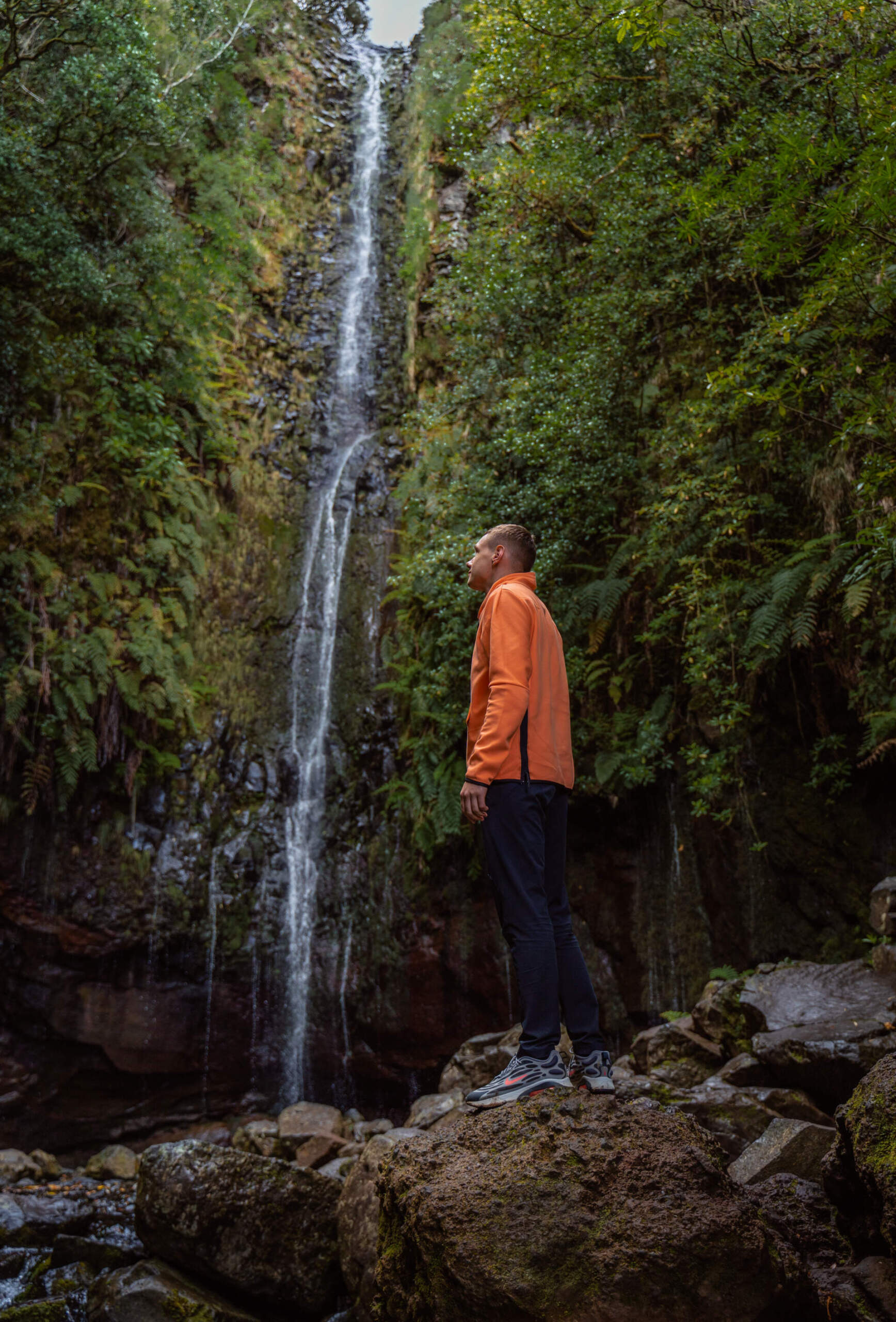 Sunkiai keliamės iš lovų ūkanotą ryta – oro prognozės ne mūsų naudai, tačiau tikslas išlieka – šiandien ieškom saulės ir krioklių Madeiros kalnuose. Išvykstam šiek tiek po 6, laukia apie 40 minučių kelias kalnų link ir dar 20 minučių kelio pėsčiomis iki atodangos (Bica Da Cana Pinaculo) pro kurią turėtų tekėti saulė. Bevažiuojant keliu pro mašinos ratus prašoka 5 triušiai – visi sėkmingai, turbūt mašinos žibintai juos pažadino miegančius šalia kelio 😀 Nuvykus į mašinų aikštelę supratom, jog saulės šįryt nematysim – pradėjo lynoti, o kalną apgaubė daug lietaus debesų. Na, būna ir nenusisekusių dienų – vykstam į toliau numatytą žygį – vieną žymiausių Madeiros takų: PR6 Levada das 25 Fontes / Levada do Risco. Žinodami jog jis yra vienas populiariausių takų nusigavome ten pirmieji ir tarp debesų keliavome tako link. Šis takas tęsiasi 13km į abi puses, o smagu tai, jog grįžtant nereikia eiti tuo pačiu keliu – grįžtama lanku. Bundanti gamta, miško kvapas ir paukščiukų čiulbėjimas lydi mus kelyje iki pirmojo krioklio – Risco waterfall. Apsižvalgę prie šio 100 metrų krioklio grįžtame į pagrindinį taką ir be abejo sutinkame taip pat ankstyvuosius turistus, kurie žinoma taip pat yra iš Lietuvos 😀