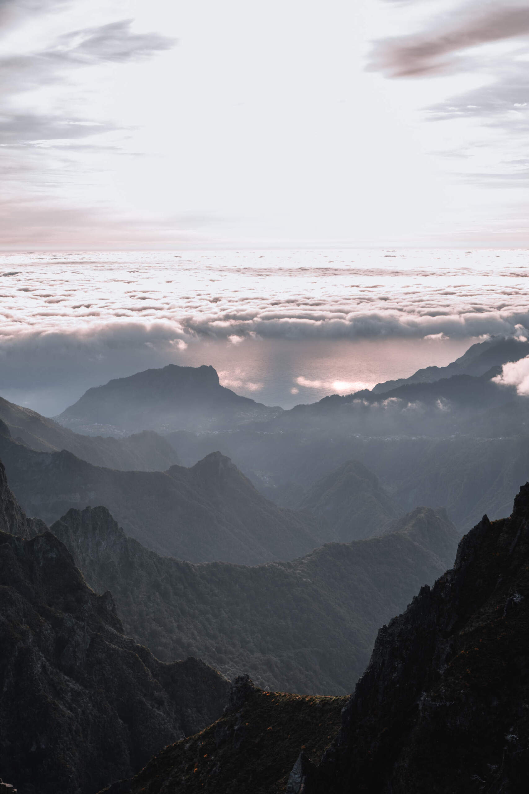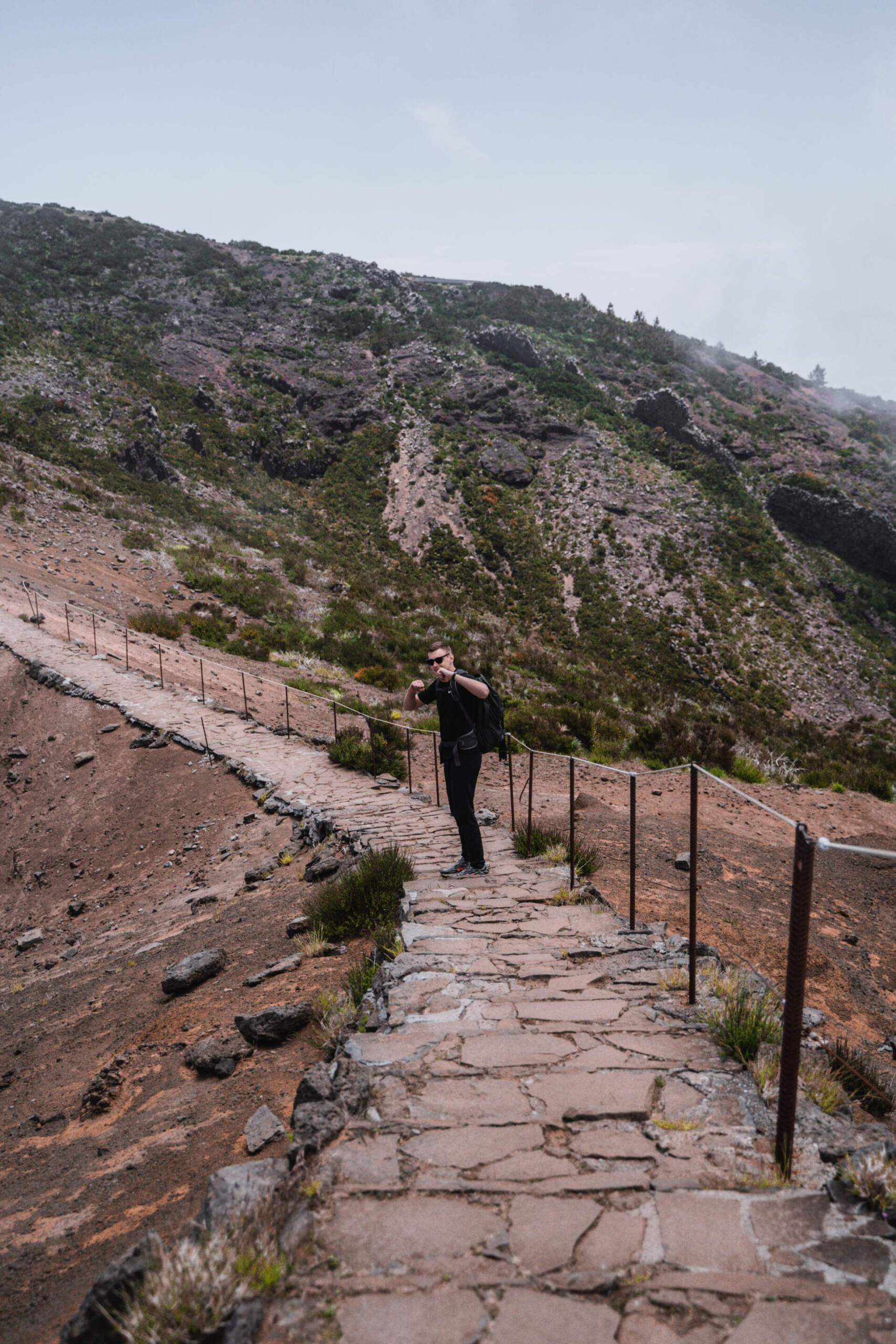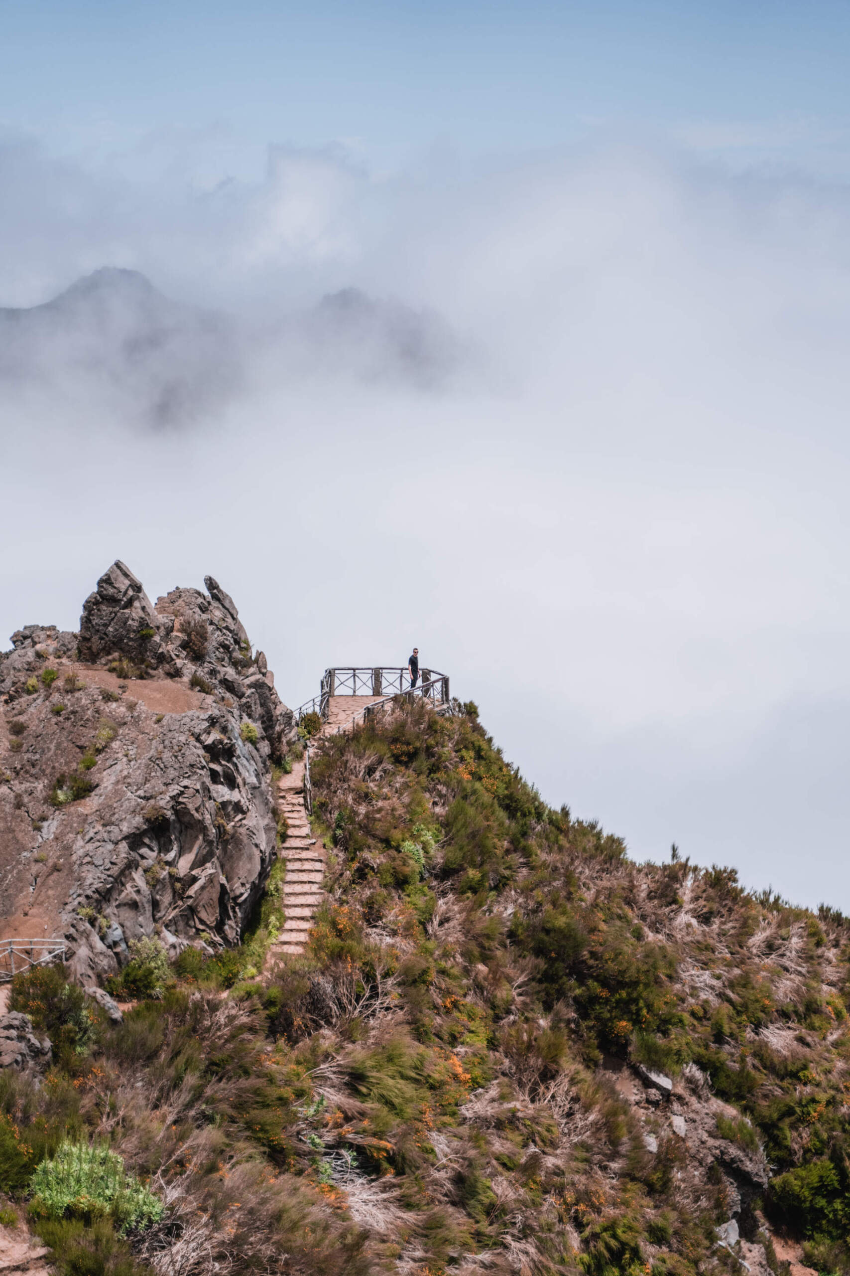 Keliames anksti – apie 5 ryto, greitai susipakuojame, pertikriname orus, lengvai užkandame ir sėdam į mašiną, laukia ilgas kelias. Šią viršūnę buvom susiplanavę aplankyti būdami rytinėje Madeiros pusėje (nes buvo arčiau), tačiau pasikeitus planams dabar tenka važiuoti virš valandos kelio į kitą Madeiros pusę. Beveik pasiekę kalno viršūnę pamatome, jog greičiausiai nespėsime pamatyti saulėtekio jeigu toliau važiuosime keliu, tad radę pirmą pasitaikiusią vietą lipoma iš mašinos ir lėkeme link debesų masyvo. Tai buvo vienas gražiausių saulės patekėjimų kokius buvome mate, saulė iš lėto kilo debesimis ir nušvietė kalno viršūnę. Saulei šiek tiek pakilus lipoma atgal į mašiną ir pavažiavome dar 10 minučių iki “Pico de Arieiro” viršūnęs – mūsų tako pradžios (PR1). Čia mus pasitiko gausus turistų būrys, kuris atvyko tik pažiūrėti kaip teka saulė ir keliauja atgal namo, kita dalis buvo nusiteikusi įveikti šį iššukį.